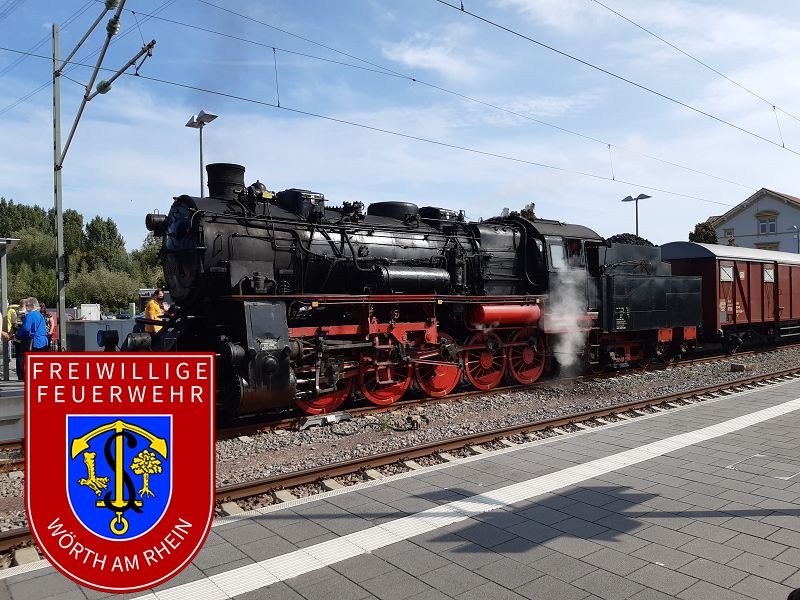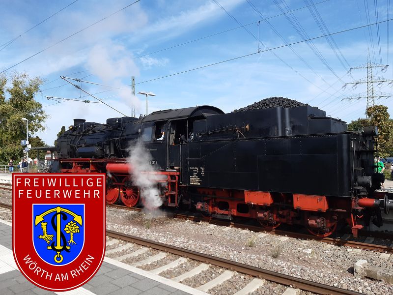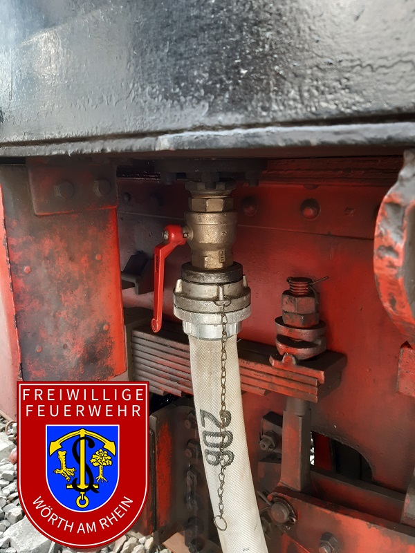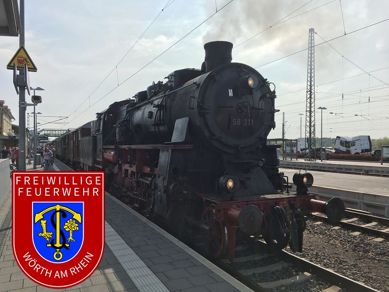 An diesem Sonntag hatten wir zur Abwechslung eine ganz besondere Aufgabe bei uns im Ort: Im Wörther Bahnhof war eine historische Dampflok zu Gast, die wir mit Wasser versorgten. Die Lokomotive 58 311 der Ulmer Eisenbahnfreunde fuhr von Karlsruhe aus auf Gleis 1 in den Wörther Bahnhof ein. Sie fasste bei uns Wasser, um für ihre Rückfahrt und anschließende Rundfahrt in der Region um Karlsruhe ausreichend Reserven dabei zu haben. Um die Weiterfahrt nicht zu gefährden, war eine pünktliche Wasserversorgung notwendig. Die benötigten Schläuche wurden also schon frühzeitig vor dem Eintreffen des historischen Zuges verlegt. Nachdem die im Jahr 1921 erbaute Dampflok betankt war, wurde sie von den Waggons abgekuppelt, wodurch sie nebenan auf Gleis 2 an das andere Ende des Zuges rangieren konnte, um diesen rückwärts wieder über die Rheinbrücke auf die badische Flussseite zu ziehen. Das tat sie dann auch, als das Signal die Weiterfahrt ermöglichte.