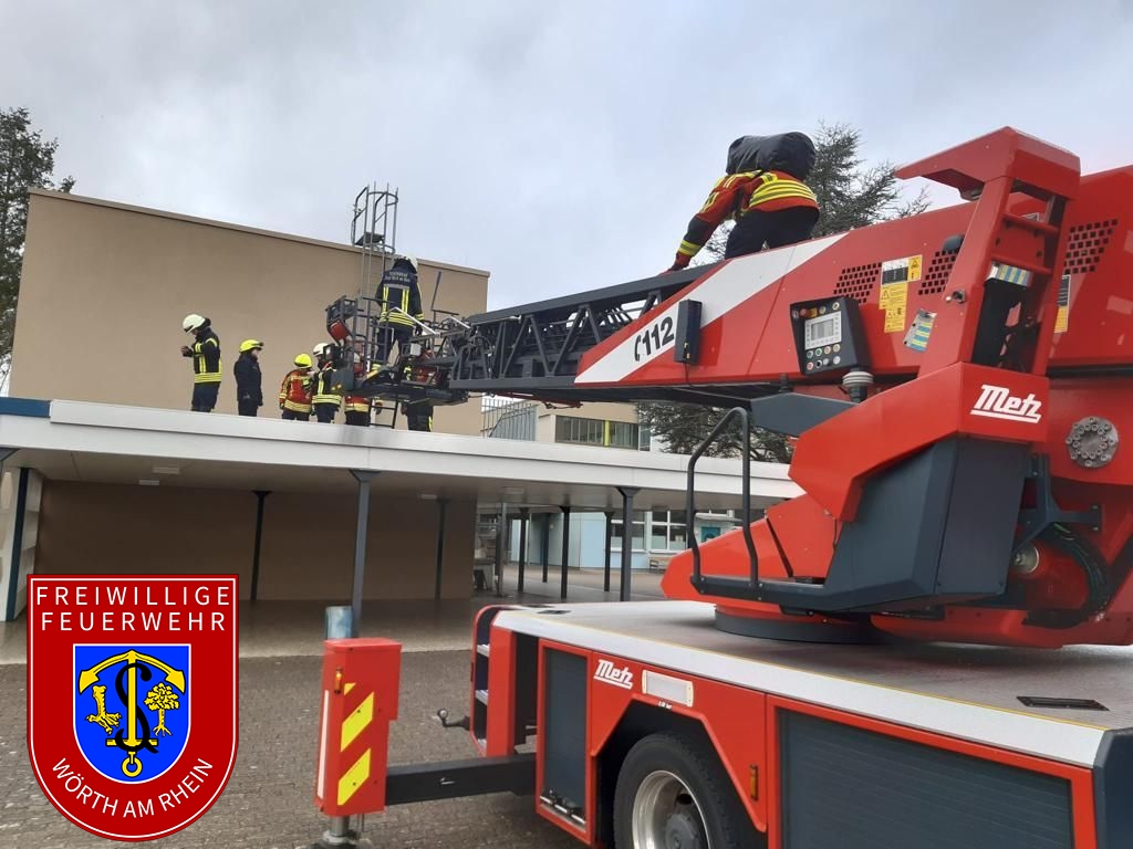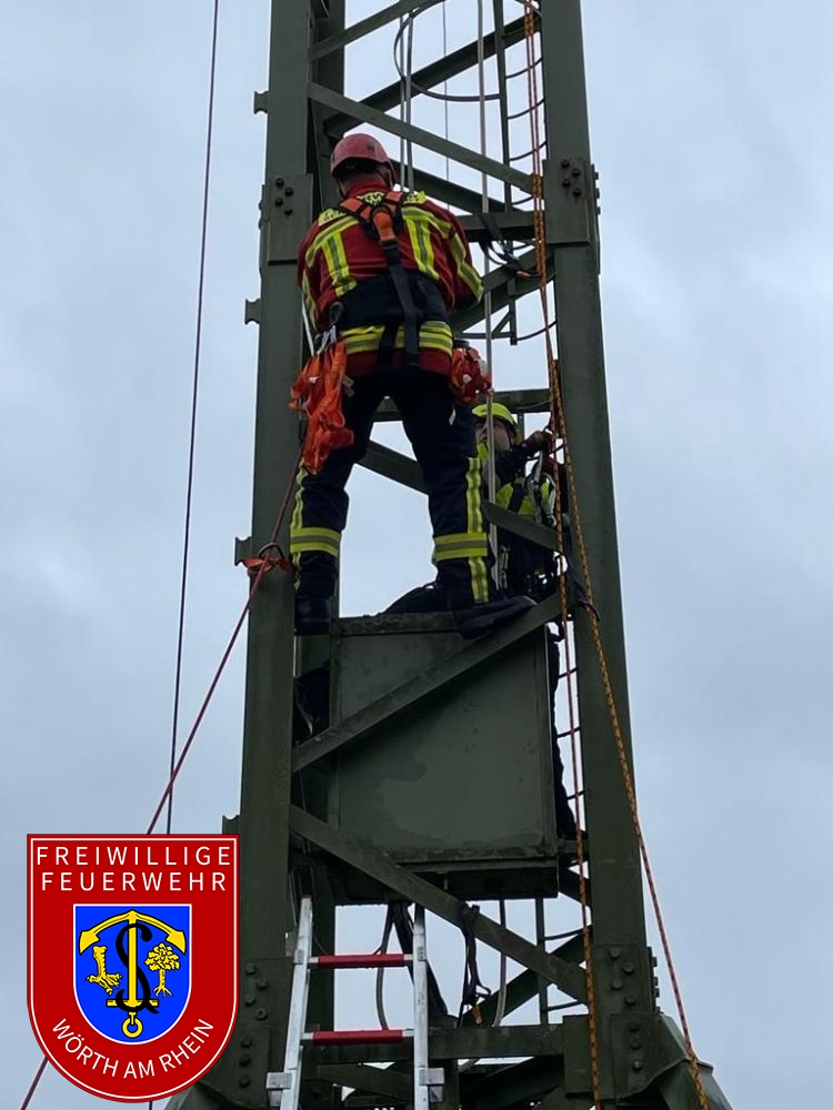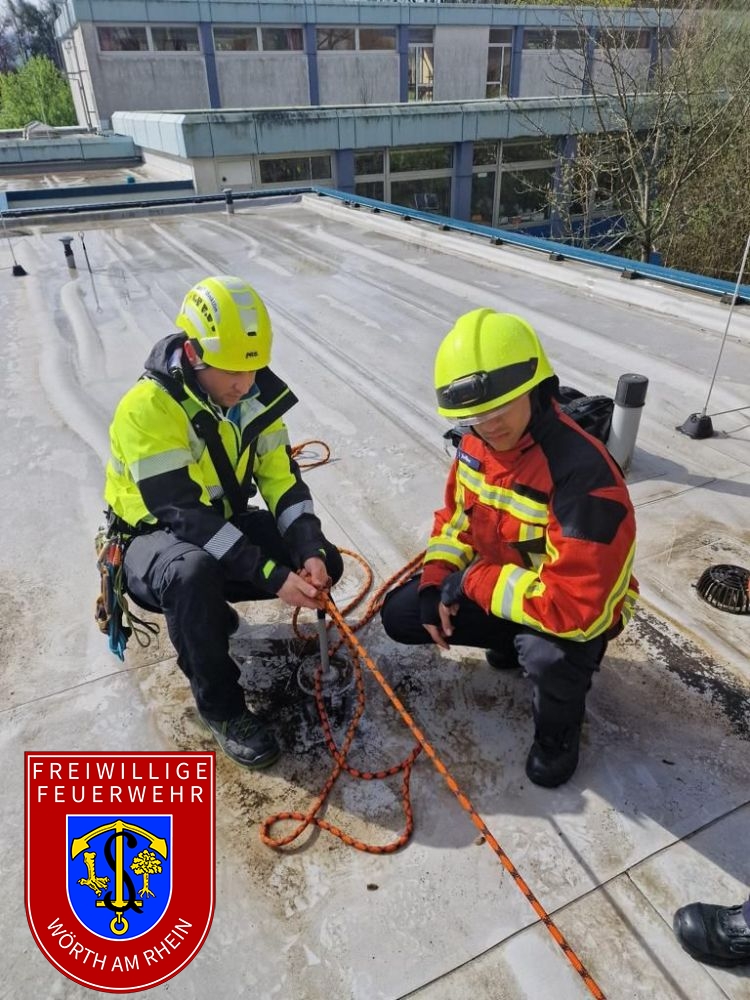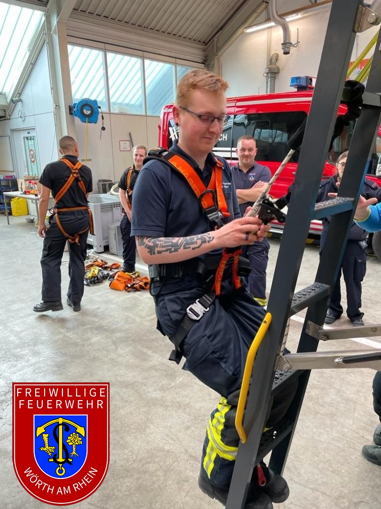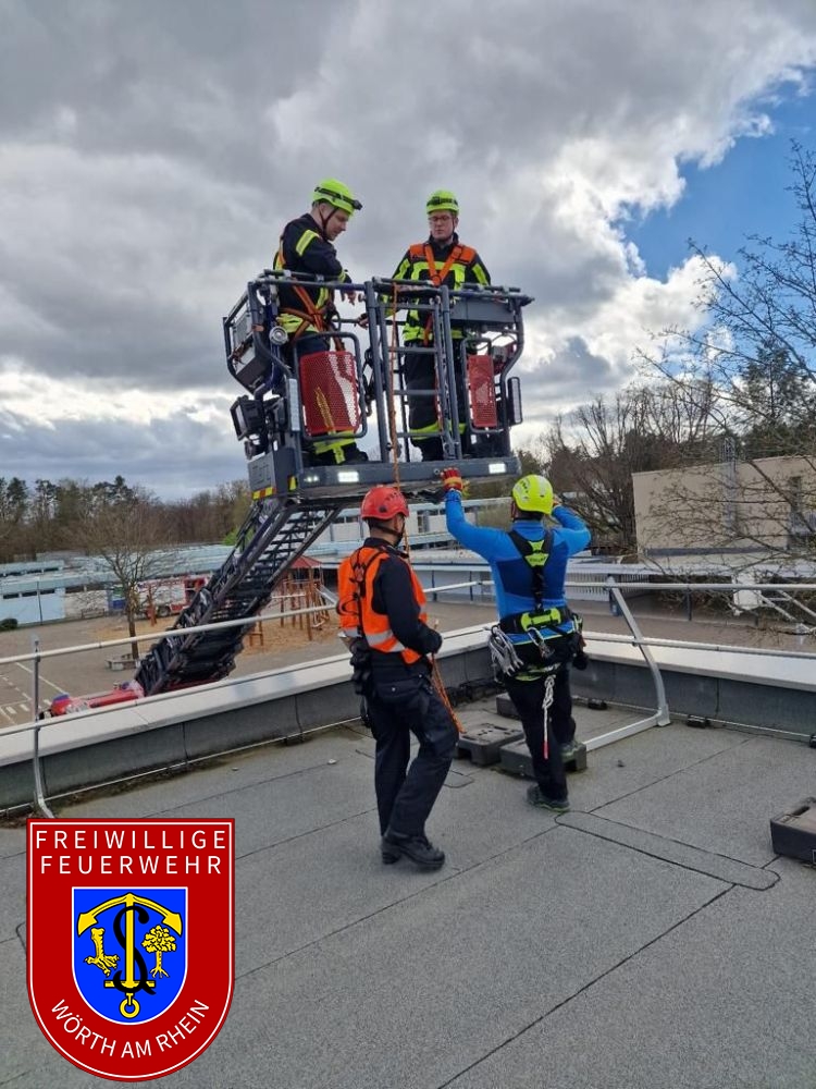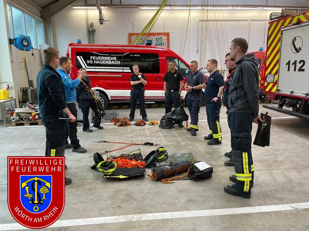 Gemeinsam mit der Fa. SeilTechnikUlm und deren Ausbilder Julian Richter – im Hauptberuf selbst Feuerwehrmann und Ausbilder in der Höhenrettung – haben wir daher erstmals am vergangenen Wochenende einen dreitägigen Inhouse-Lehrgang organsiert, an dem eine Kameradin und drei Kameraden aus der Verbandsgemeinde Hagenbach, sowie vier Kameraden aus dem Stadtgebiet Wörth teilgenommen haben. Die theoretischen und überwiegend praktischen Ausbildungsinhalte wurden dabei abwechselnd an beiden Feuerwehrstandorten und an besonderen Objekten wie z. B. auf Flachdächern von Schulen oder einem Baukran vermittelt. Hierbei eng mit eingebunden war das Drehleiterfahrzeug der Feuerwehr Wörth, das auch innerhalb der Verbandsgemeinde Hagenbach zum Einsatz kommt.