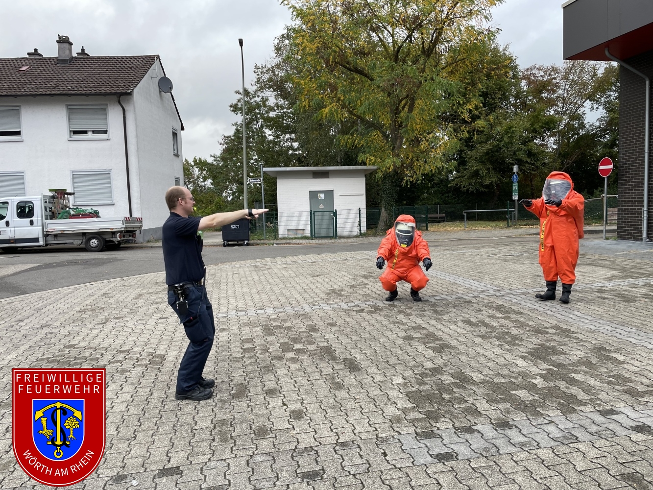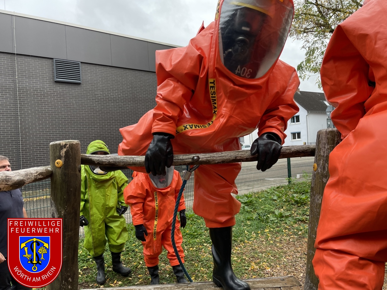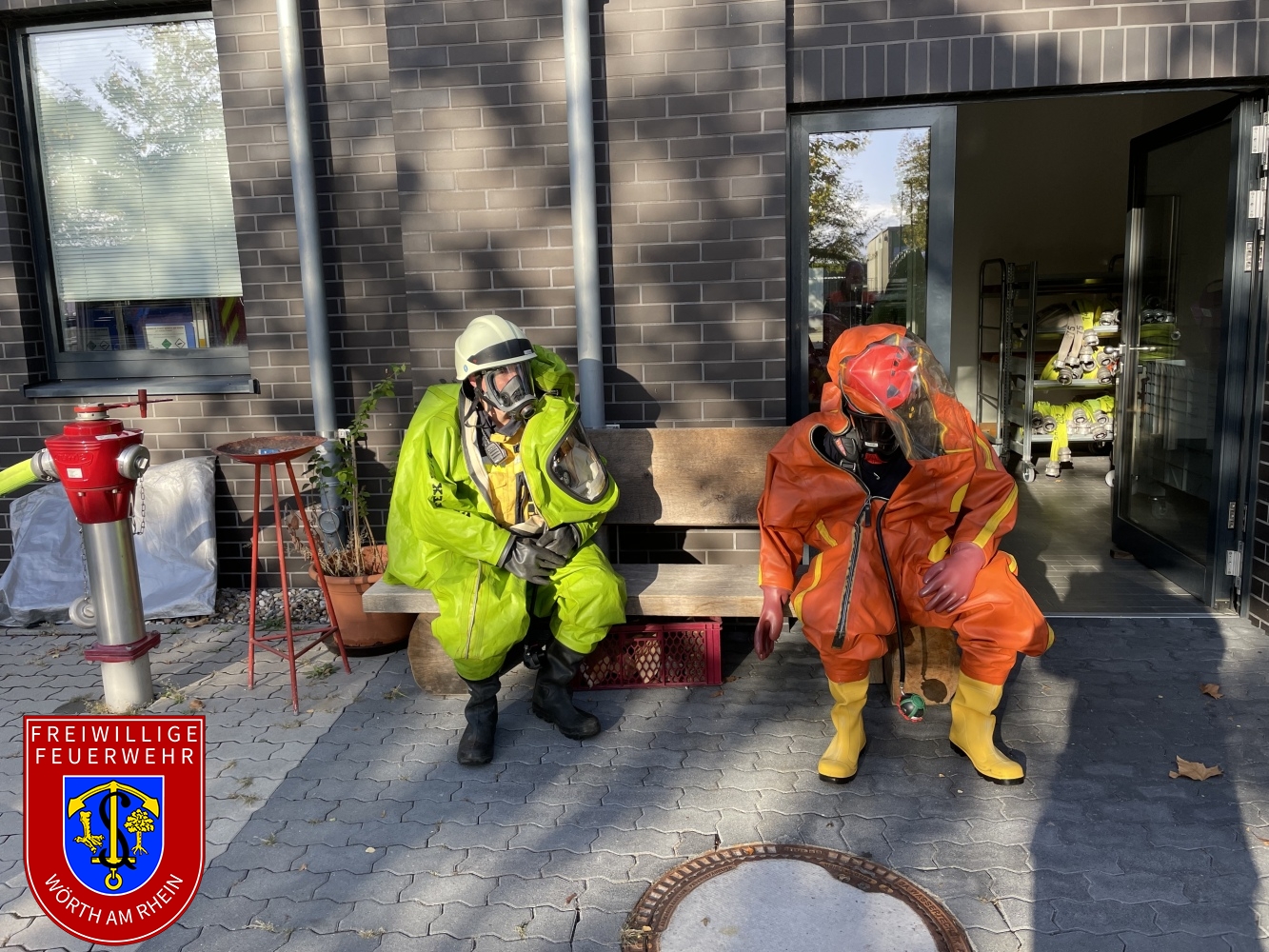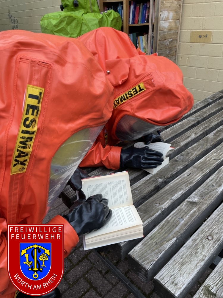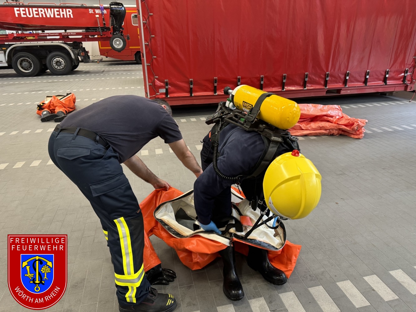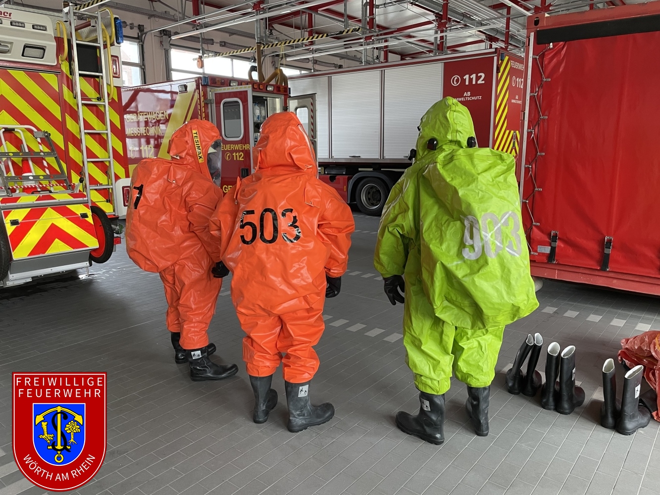 An den letzten beiden Wochenenden fand bei uns in Wörth der Lehrgang zum Tragen von Chemikalienschutzanzügen (CSA) des Landkreises Germersheim statt. Dieser wurde erneut in einem Hybridmodell, also teilweise online und teilweise in unserem Gerätehaus als Präsenzveranstaltung durchgeführt. Das Lehrgangsziel ist, dass sich die Kameraden an das Tragen eines CSA gewöhnen. Damit verbunden sind erschwerte Einsatzbedingungen wie eine erhöhte körperliche Belastung beim Ausführen von Arbeiten.