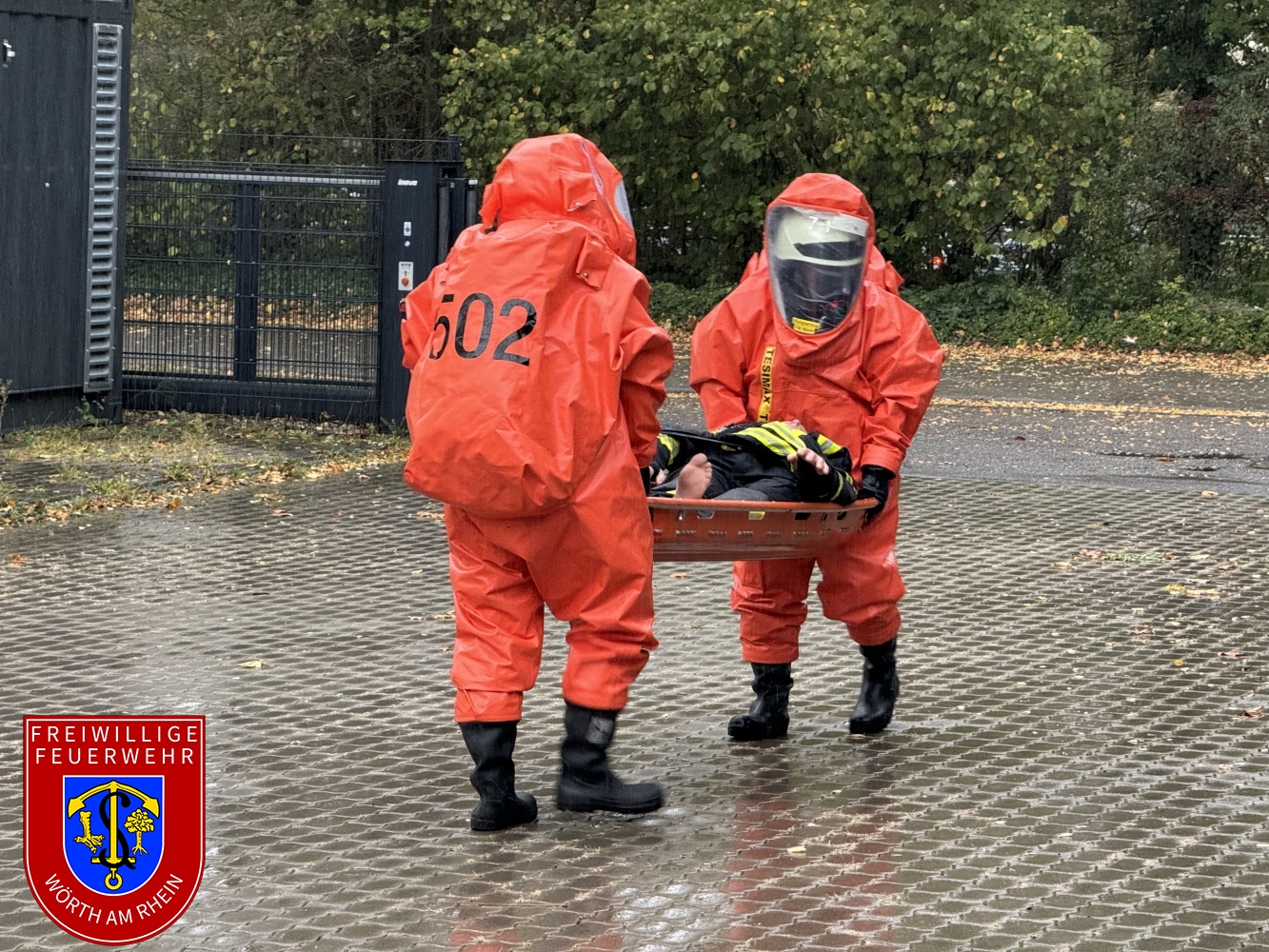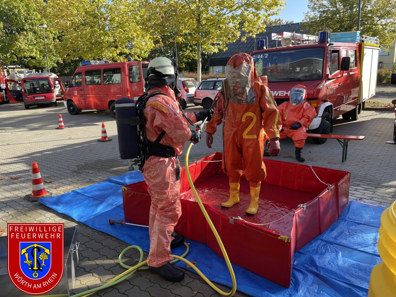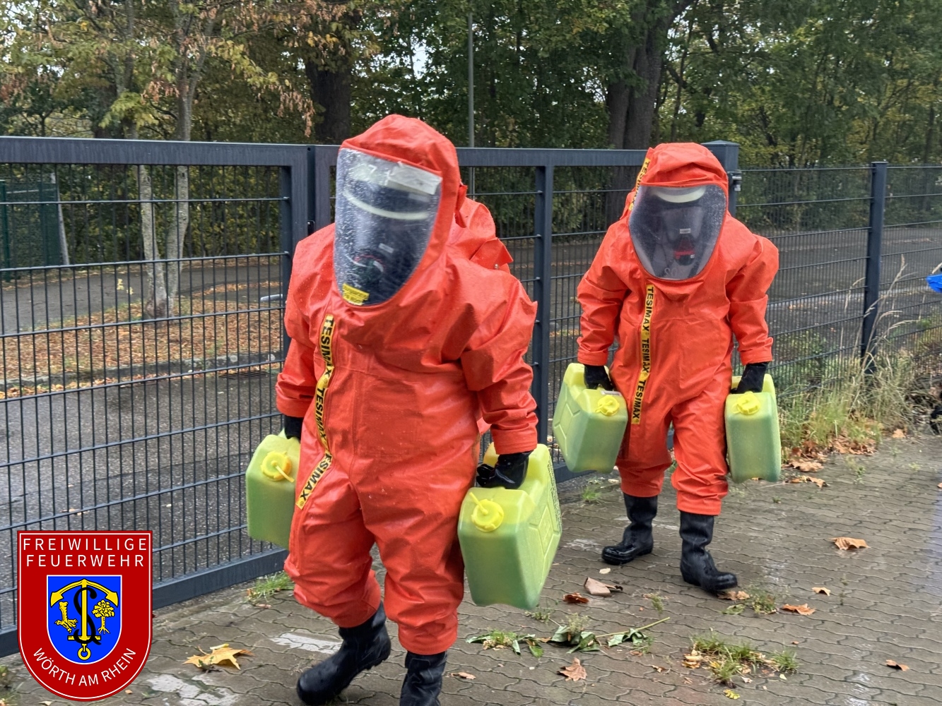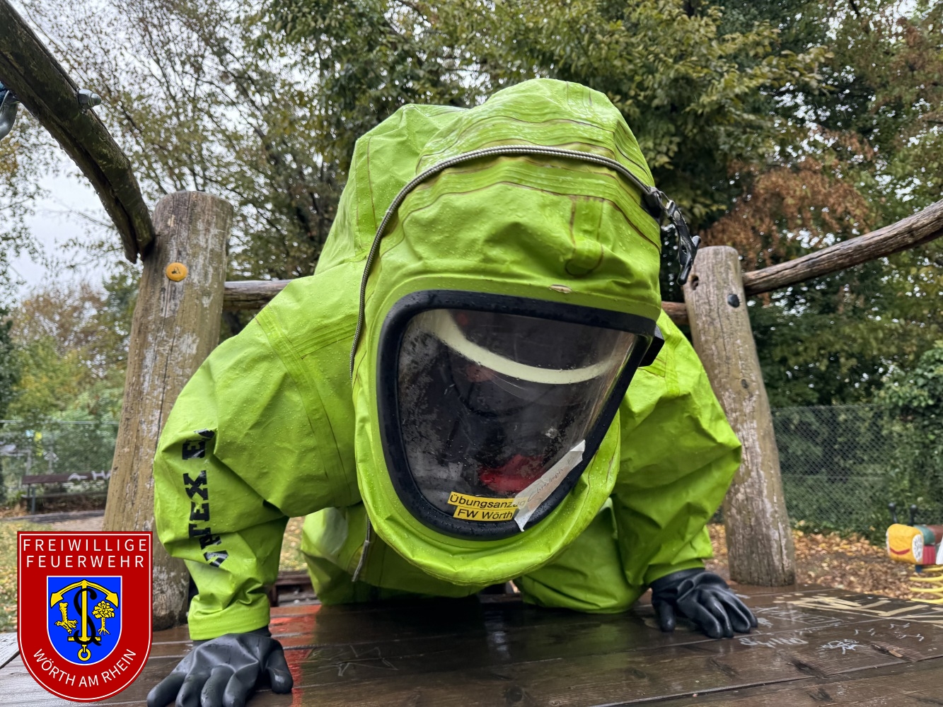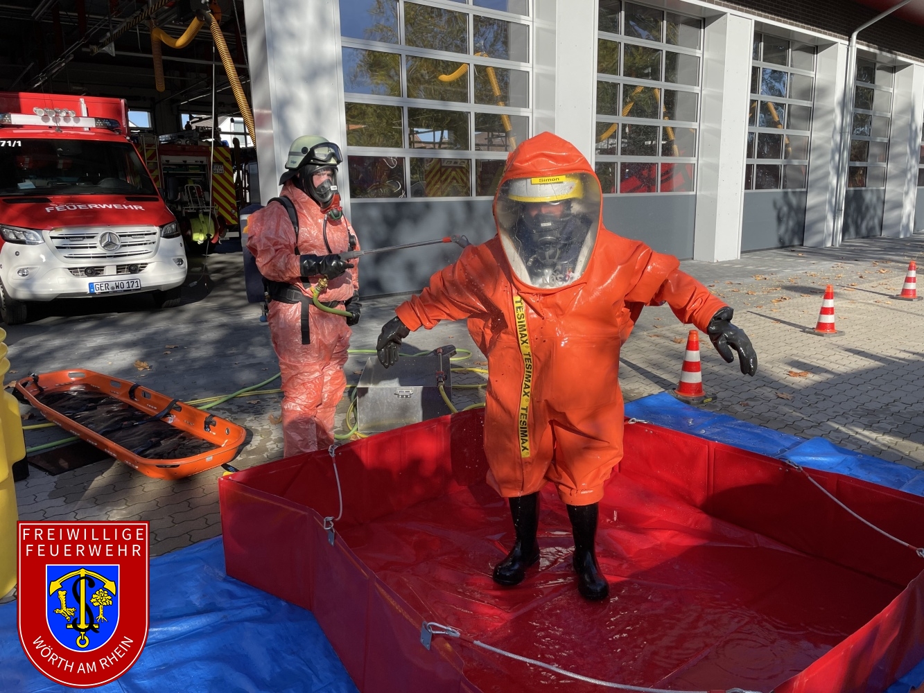 An den letzten beiden Wochenenden fand bei uns in Wörth der Lehrgang zum Tragen von Chemikalienschutzanzügen (CSA) des Landkreises Germersheim statt. Dieser wurde erneut in einem Hybridmodell, also teilweise online und teilweise in unserem Gerätehaus als Präsenzveranstaltung durchgeführt. Das Lehrgangsziel ist, dass sich die Kameraden an das Tragen eines CSA gewöhnen. Damit verbunden sind erschwerte Einsatzbedingungen wie eine erhöhte körperliche Belastung beim Ausführen von Arbeiten.