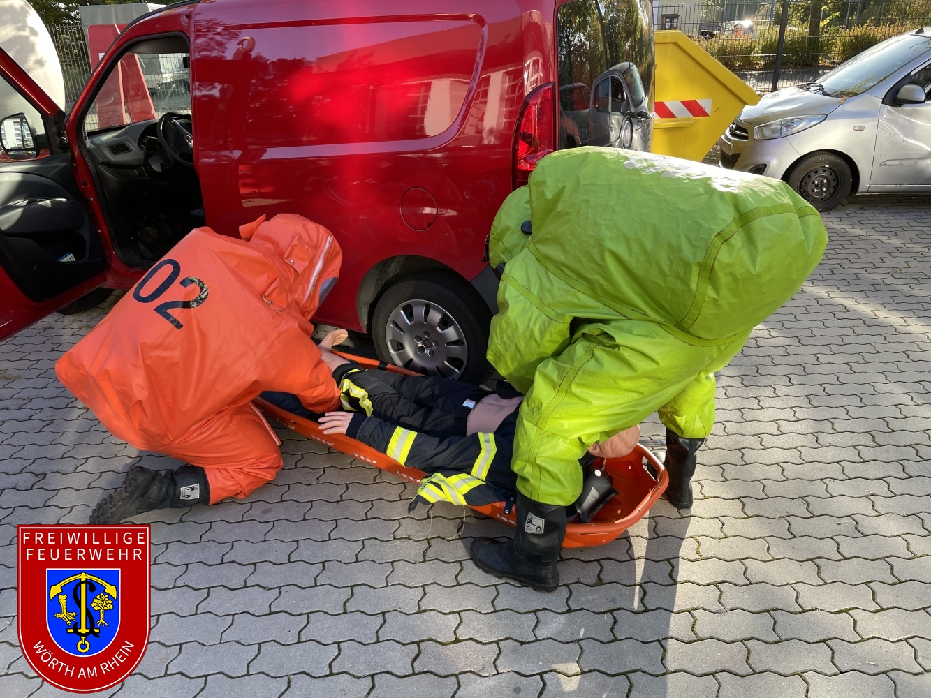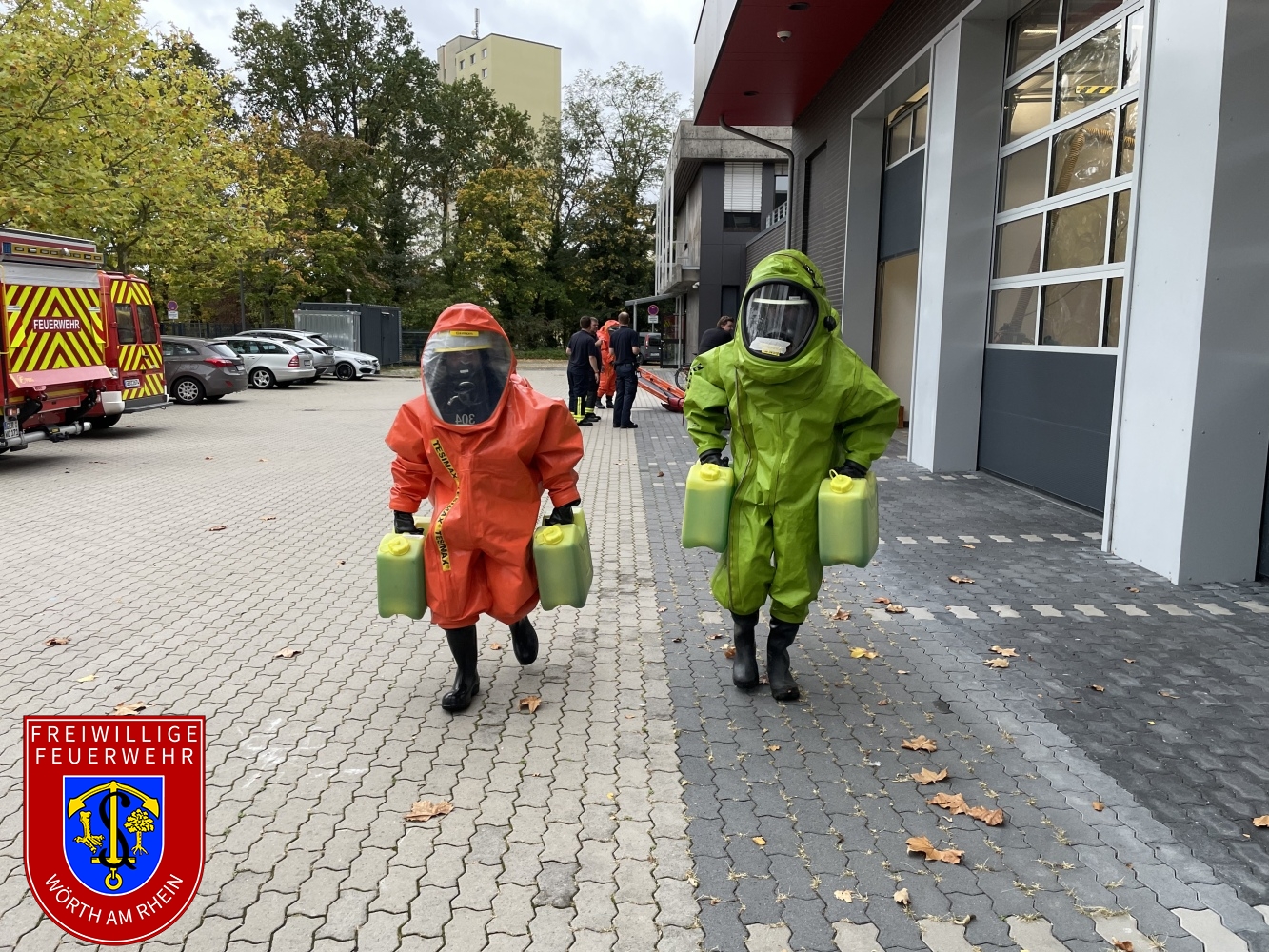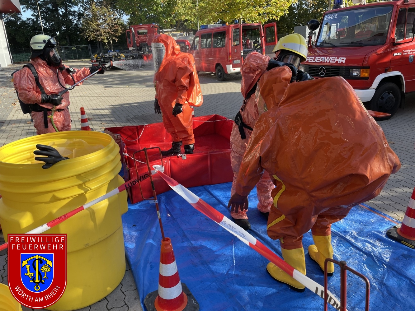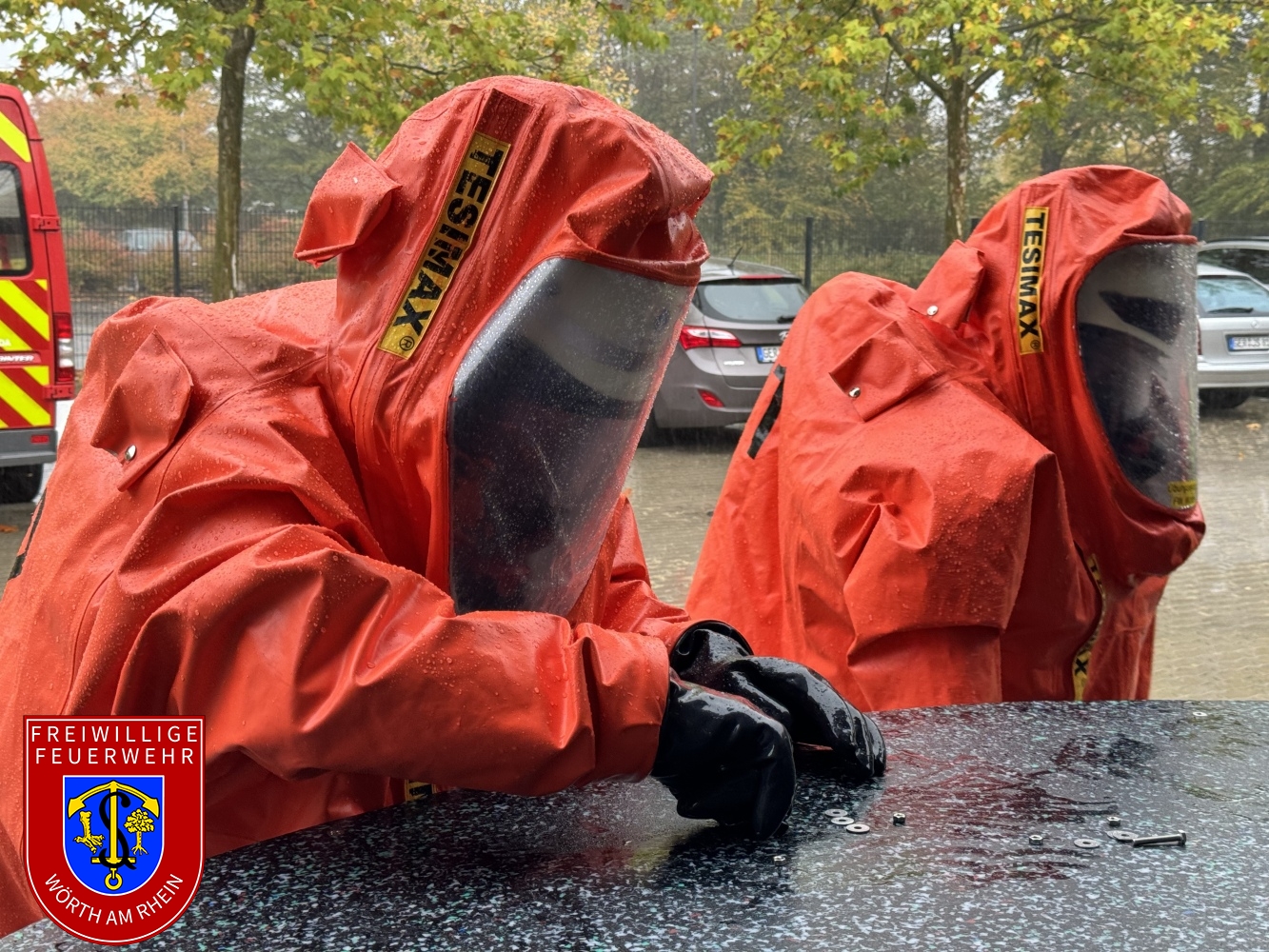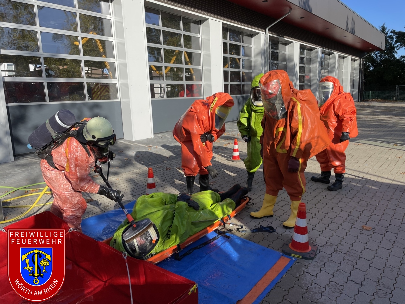 An den letzten beiden Wochenenden fand bei uns in Wörth der Lehrgang zum Tragen von Chemikalienschutzanzügen (CSA) des Landkreises Germersheim statt. Dieser wurde erneut in einem Hybridmodell, also teilweise online und teilweise in unserem Gerätehaus als Präsenzveranstaltung durchgeführt. Das Lehrgangsziel ist, dass sich die Kameraden an das Tragen eines CSA gewöhnen. Damit verbunden sind erschwerte Einsatzbedingungen wie eine erhöhte körperliche Belastung beim Ausführen von Arbeiten.