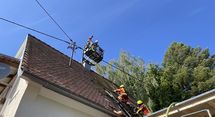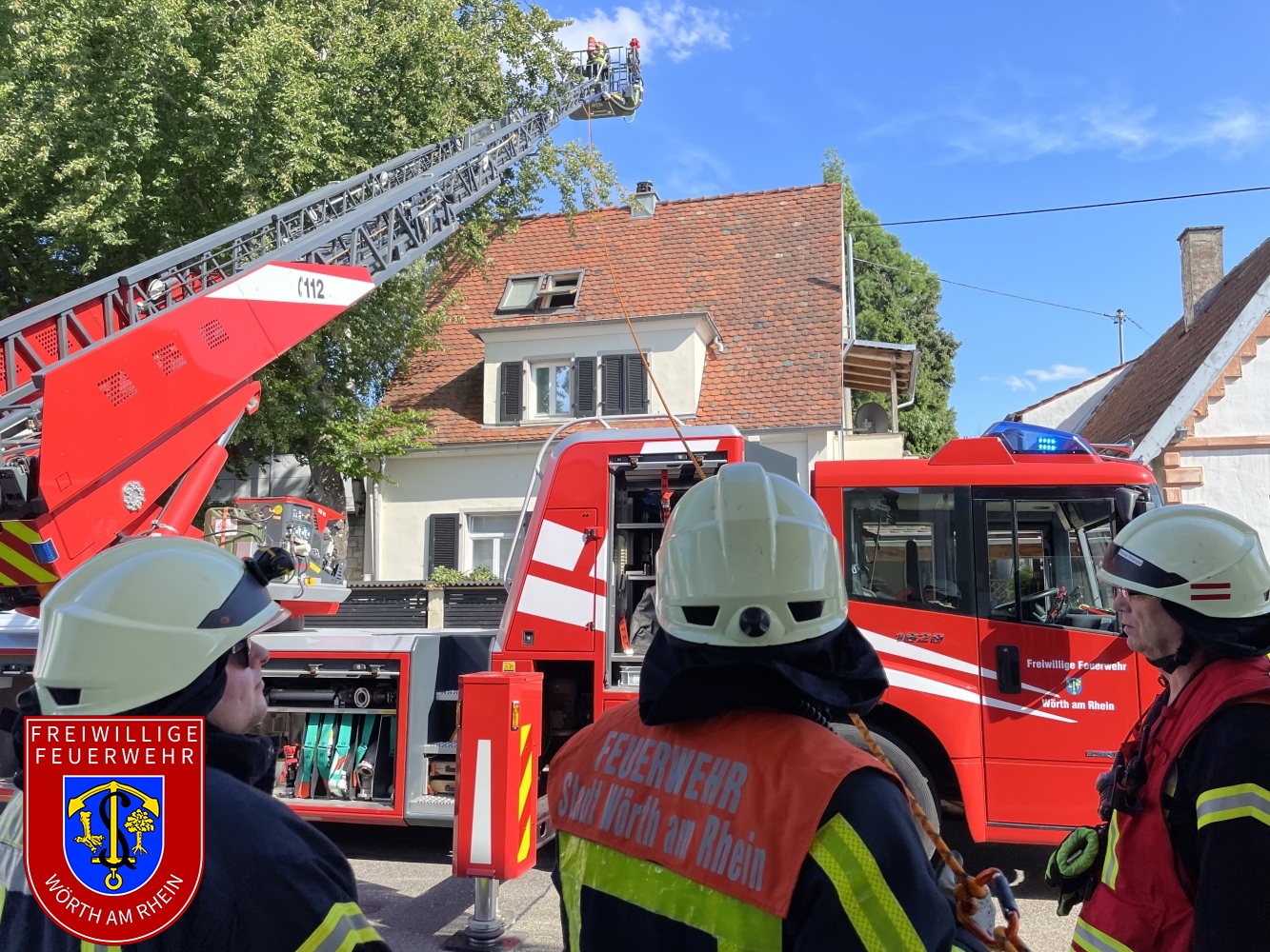 Wir unterstützten bei der Absicherung der am Dach eingesetzten Kräfte. Dabei kam auch unser Gerätesatz Absturzsicherung zum Einsatz. So konnten die Arbeiten am Dach mit Hilfe einer Toprope-Sicherung problemlos erledigt werden. Hier kam wieder das Zusammenspiel der Einsatzkräfte der Kommunen Hagenbach und Wörth am Rhein zum Tragen, welches insbesondere im Bereich der Absturzsicherung in diesem Jahr deutlich verstärkt wurde.