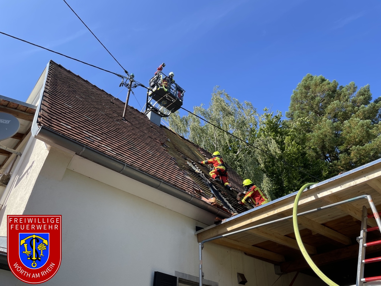 Wir wurden zur Unterstützung unserer Kameraden der Verbandsgemeinde Hagenbach zu einem Gebäudebrand in Hagenbach alarmiert. Vor Ort stellte sich heraus, dass der Dachstuhl eines Wohngebäudes brannte. Auf der straßenabgewandten Dachseite war eine deutliche Rauchentwicklung sichtbar. Da ein Trupp unter Atemschutz schnell die Brandbekämpfung beginnen konnte, konnte eine weitere Ausbreitung des Feuers verhindert werden. Im Zuge der Löscharbeiten mussten Teile des Dachs abgedeckt und entfernt werden.