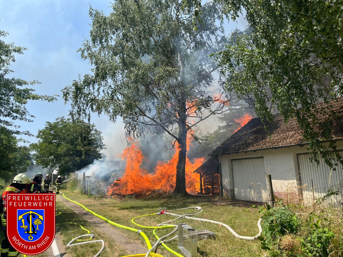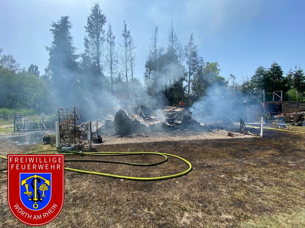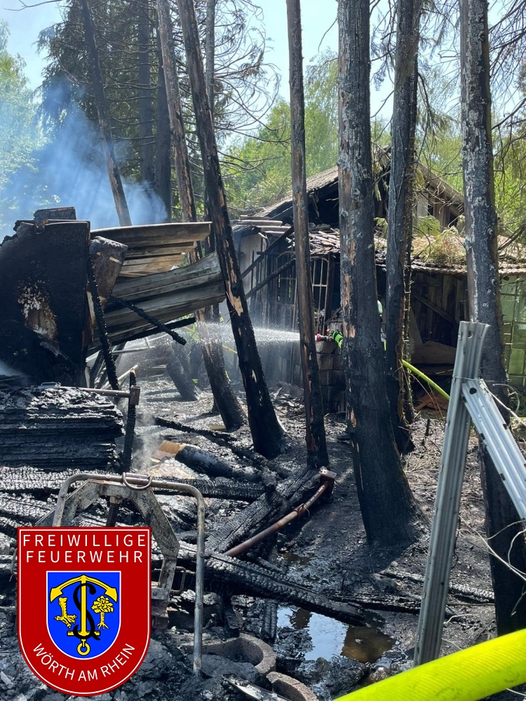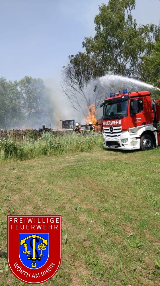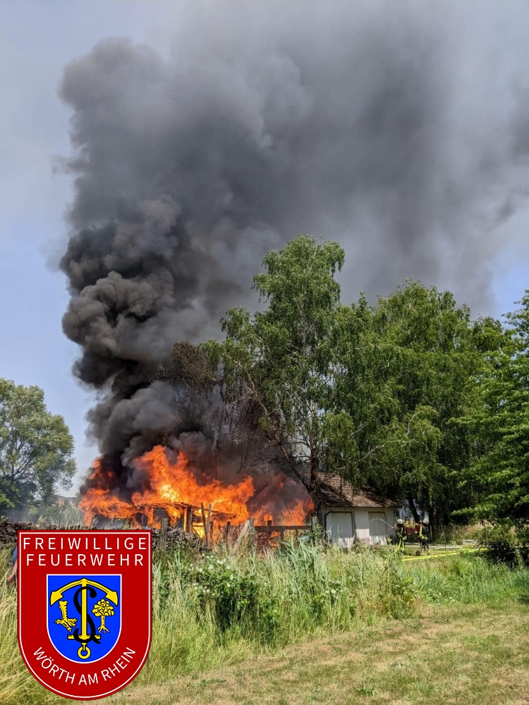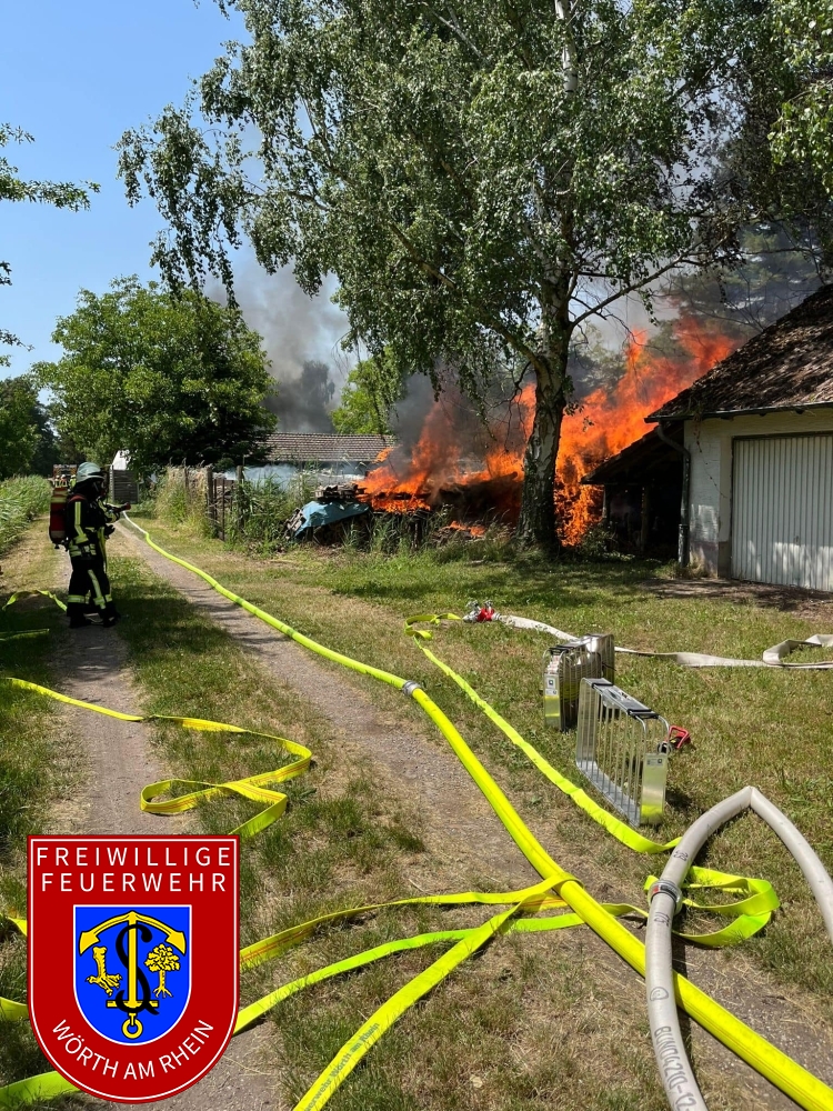 Zusammen mit den Kameraden aus Schaidt wurden wir zu einem gemeldeten Nebengebäudebrand alarmiert. Kurz nach dem eintreffen an der Einsatzstelle erhöhte der Einsatzleiter das Alarmstichwort, weshalb umgehende Stadtvollalarm ausgelöst wurde. Außerdem wurden weitere wasserführende Fahrzeuge der Feuerwehr Kandel alarmiert. Noch während der ersten Löschmaßnahmen wurde durch die Einsatzkräfte eine weitere Brandstelle nur ca. 50m von der ersten entfernt festgestellt. Aufgrund des vorgefundenen Ausmaßes musste der Einsatz in mehrere Abschnitte eingeteilt werden. Durch den Einsatz von mehreren Strahlrohren und eines Wasserwerfers konnte der Brand unter Kontrolle gebracht werden. Die Nachlöscharbeiten zogen sich bis in die frühen Abendstunden.