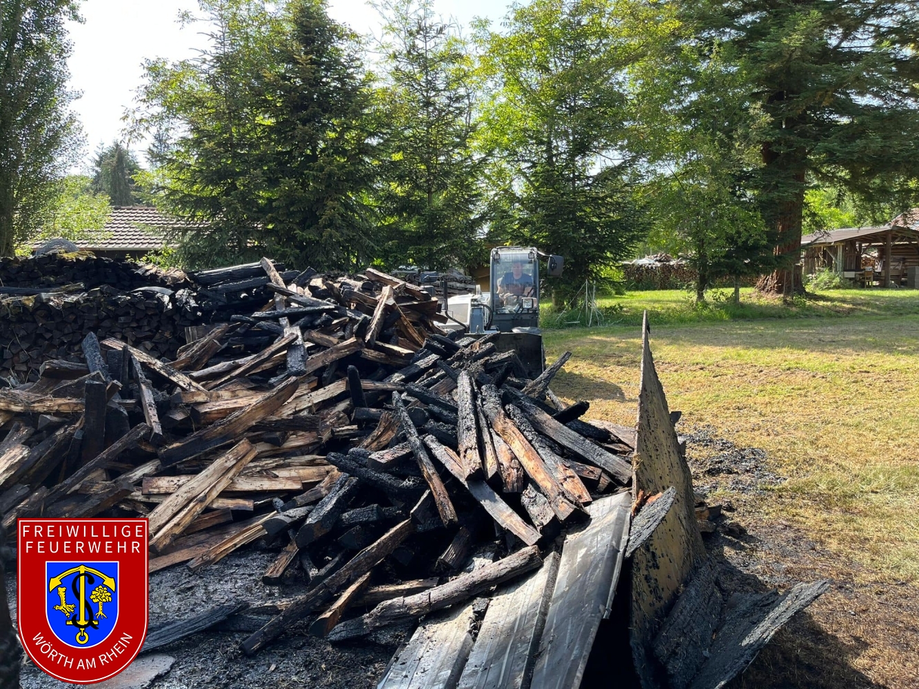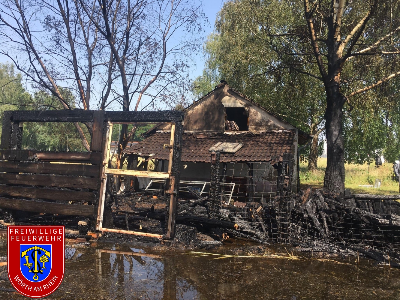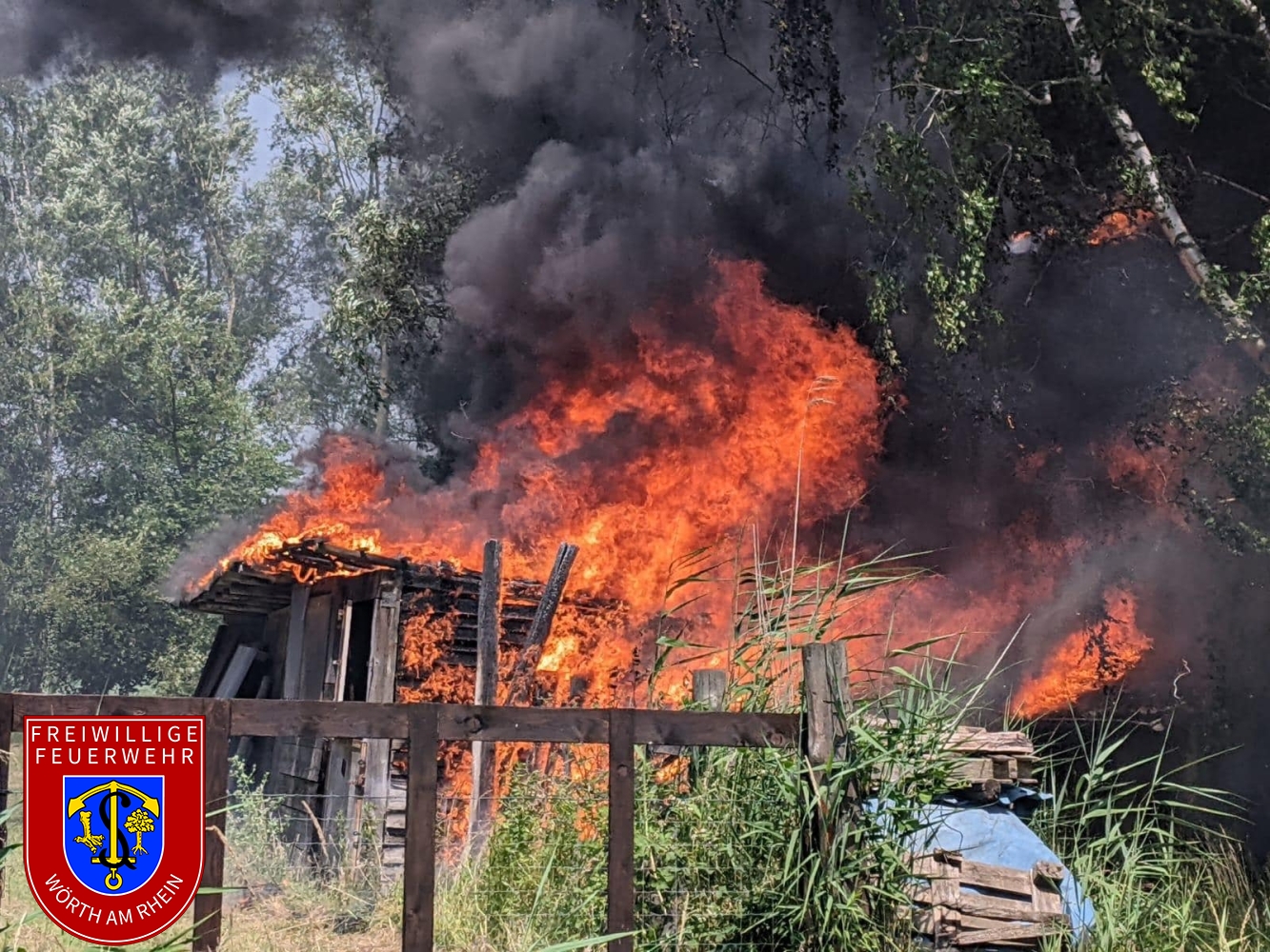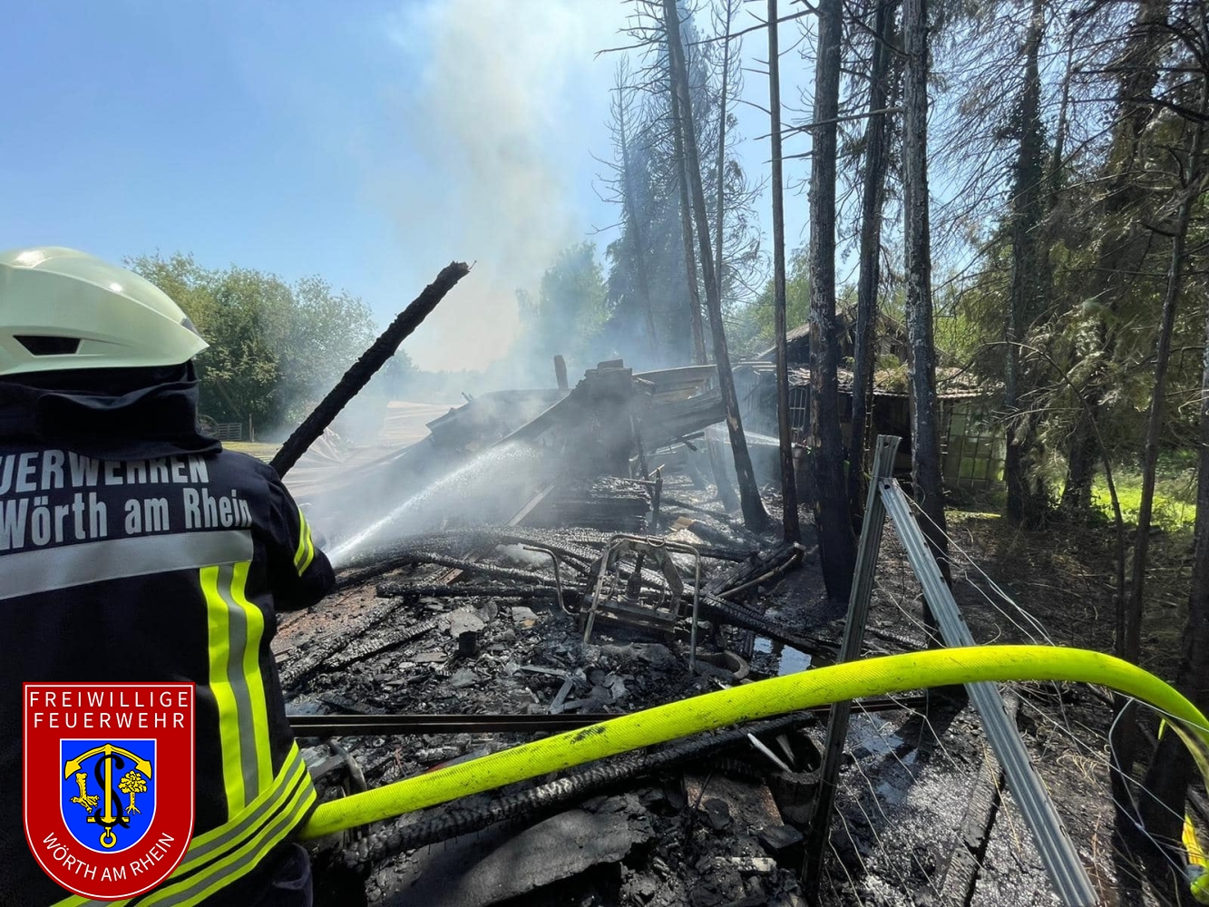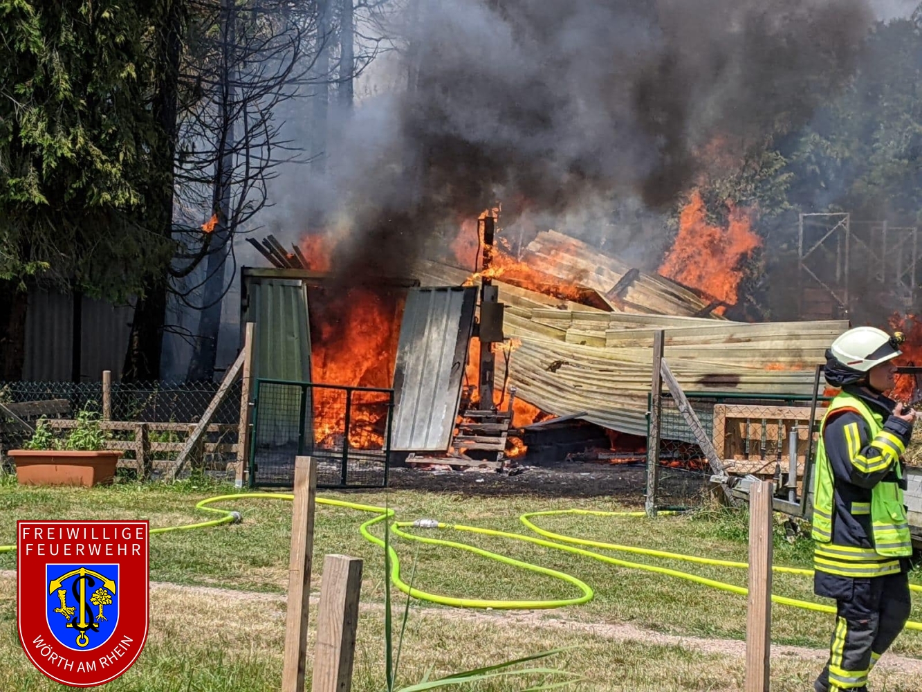 Zusammen mit den Kameraden aus Schaidt wurden wir zu einem gemeldeten Nebengebäudebrand alarmiert. Kurz nach dem eintreffen an der Einsatzstelle erhöhte der Einsatzleiter das Alarmstichwort, weshalb umgehende Stadtvollalarm ausgelöst wurde. Außerdem wurden weitere wasserführende Fahrzeuge der Feuerwehr Kandel alarmiert. Noch während der ersten Löschmaßnahmen wurde durch die Einsatzkräfte eine weitere Brandstelle nur ca. 50m von der ersten entfernt festgestellt. Aufgrund des vorgefundenen Ausmaßes musste der Einsatz in mehrere Abschnitte eingeteilt werden. Durch den Einsatz von mehreren Strahlrohren und eines Wasserwerfers konnte der Brand unter Kontrolle gebracht werden. Die Nachlöscharbeiten zogen sich bis in die frühen Abendstunden.
