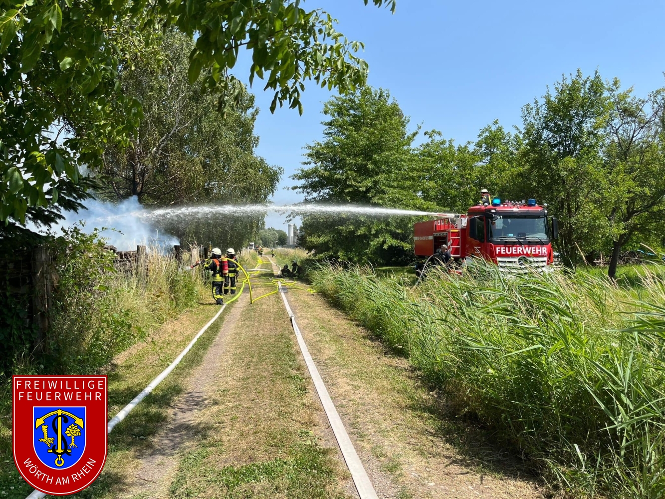 Noch während der laufenden Löscharbeiten wurden wir zur Unterstützung der Feuerwehr Hagenbach zu einem gemeldeten Wald und Flächenbrand alarmiert. Wir berichten hierzu gesondert.