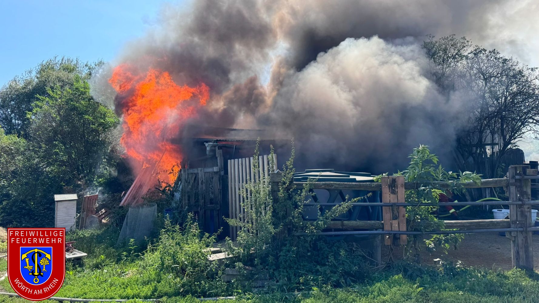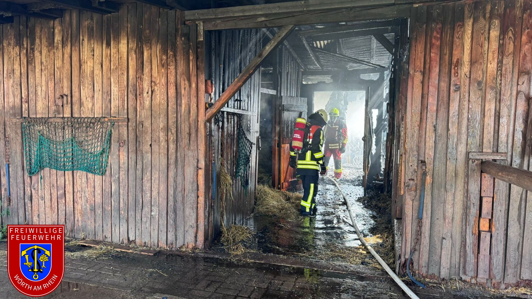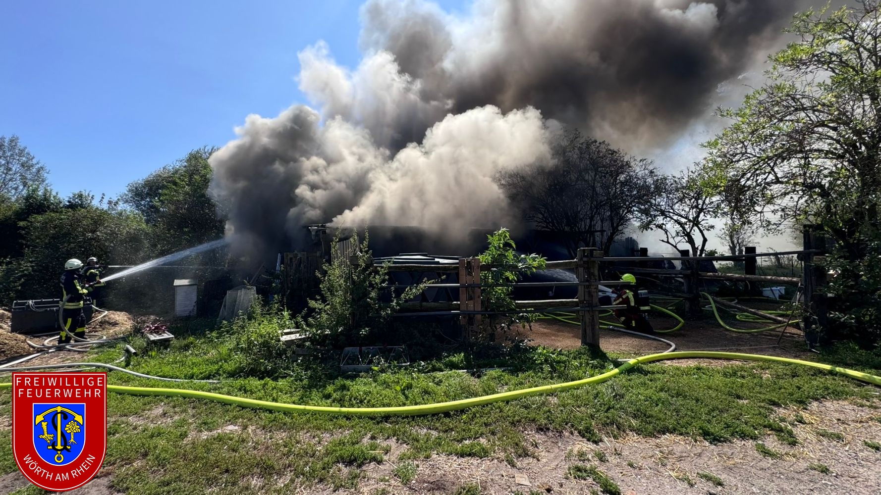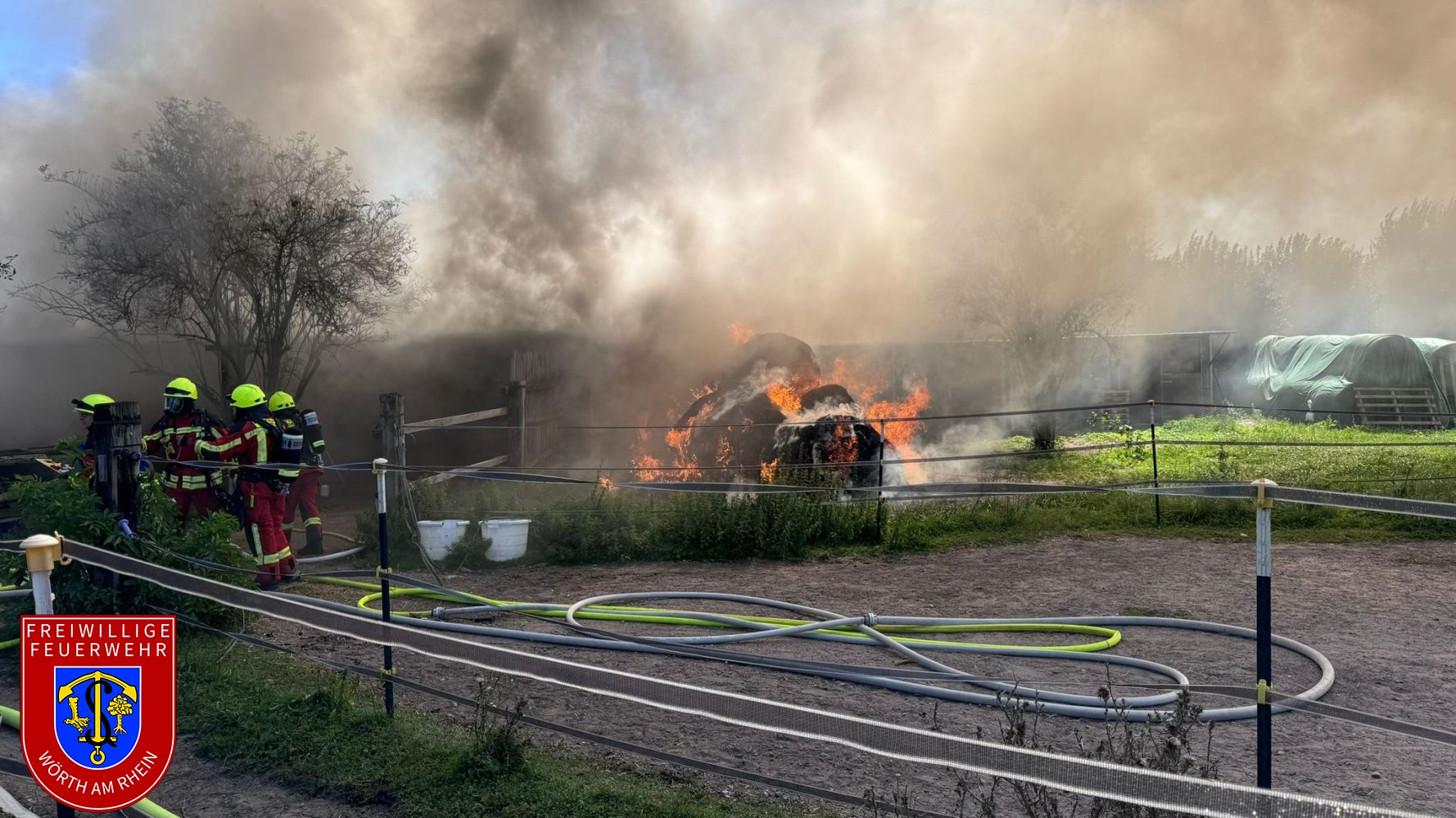 Wir wurden zur Unterstützung der Feuerwehr Hagenbach zu einem gemeldeten Brand mehrerer Rundballen alarmiert. Beim Eintreffen an der Einsatzstelle hatte sich das Feuer bereits auf eine Stallanlage sowie mehrere Unterstände ausgebreitet. Wir unterstützten die Hagenbacher Einsatzkräfte umgehend bei einem massiven Löschangriff von mehreren Seiten. Im Lauf des Einsatzes wurde Vollalarm für die Atemschutzgeräteträger der Stadt Wörth am Rhein ausgelöst. Die Drohneneinheit wurde ebenfalls an die Einsatzstelle alarmiert.
