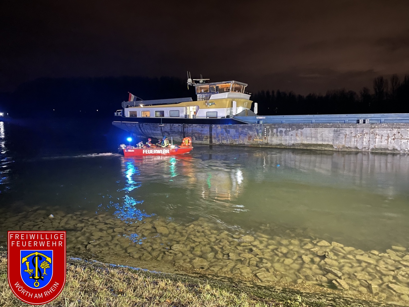 Wir leuchteten das betroffene Schiff von unserer Rheinseite und brachten unser Mehrzweckboot in den Einsatz. Die Kameraden aus Karlsruhe verschafften sich über das Hilfeleistungslöschboot PAMINA 1 Zutritt zur Einsatzstelle, sodass der Brand gelöscht werden konnte.