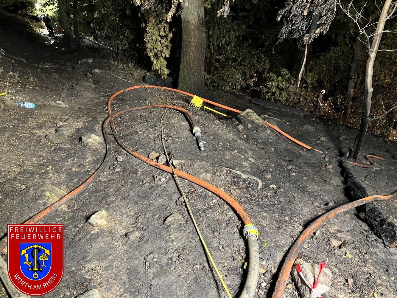 Gegen 19:30 Uhr wurden wir zu dem ca. 7 ha großen Waldbrand in Neustadt Hambach alarmiert. Der Brand- und Katastrophenschutzinspekteur Mike Schönlaub erkundete vor Ort die Lage und stimmte sich mit er Einsatzleitung der Freiwilligen Feuerwehr Neustadt ab. Die 60 Feuerwehrfrauen und Männer aus dem Katastrophenschutzzug folgten kurze Zeit später unter Führung von Jürgen Stephany und Steffen Andres. Im Waldgebiet lösten wir die Kräfte des Landkreises Süw ab. Unsere Aufgabe waren Nachlöscharbeiten, Umgraben, Glutnester suchen und die Flächen zu bewässern. Das Gelände war steil und die Dunkelheit war eine weitere Aufgabe für die Helferinnen und Helfer. Die Kolleginnen und Kollegen aus Neustadt versorgten unsere Mannschaft. Ebenso konnten wir in eine gut organisierte Führungsstruktur integriert werden. Der stellv. BKI Mario Schmid fungierte als Schnittstelle zur Einsatzleitung.
